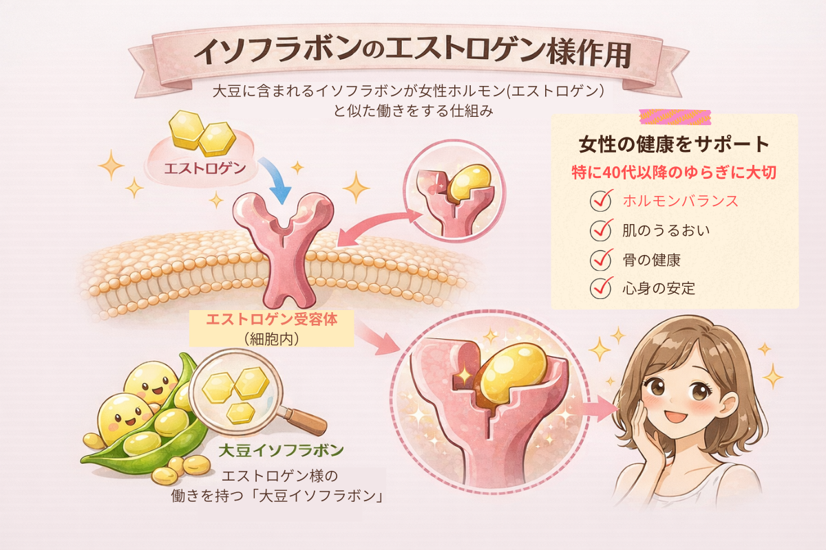 特にエストロゲンの分泌が低下しやすい40代以降では、イソフラボンがエストロゲン様に作用することで、身体のリズムを緩やかにサポートしてくれます。