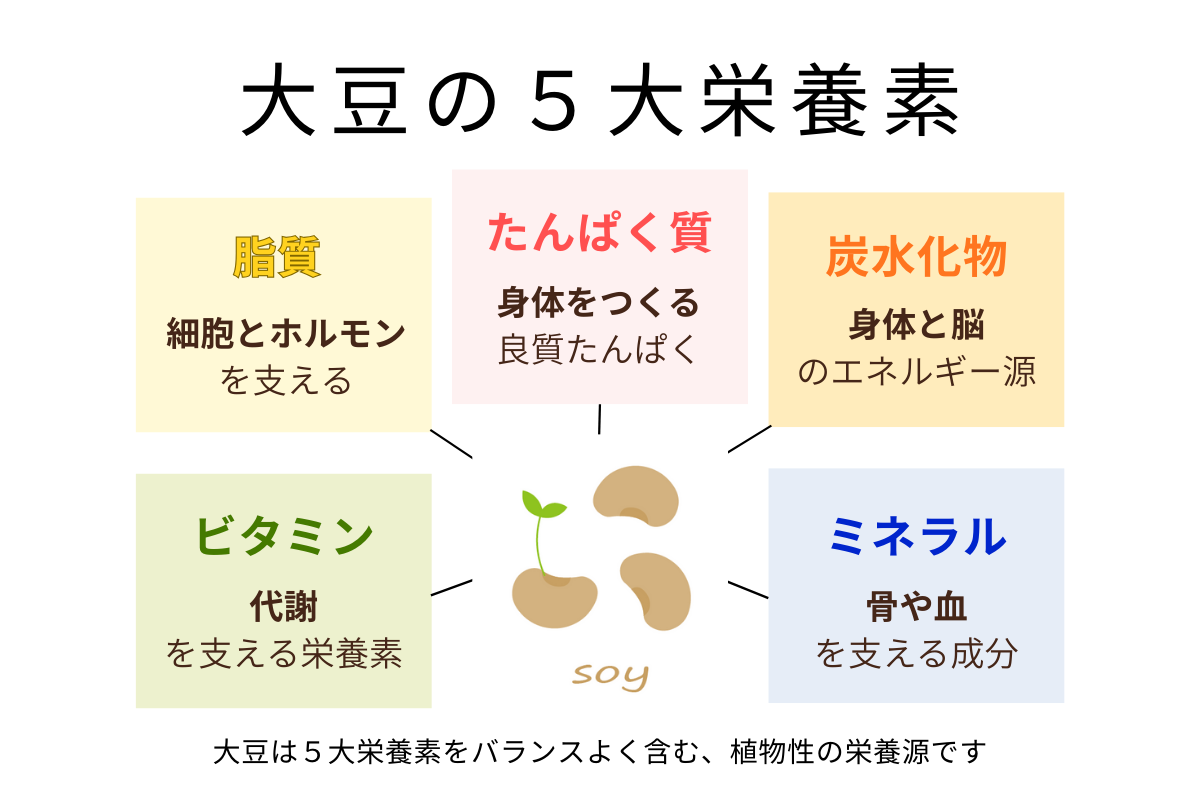 | 五大栄養素 | 大豆に含まれる主成分例 | 主な働き(身体の役割) |