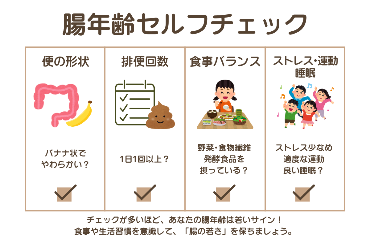 もし実年齢より高めの腸年齢が気になる場合は、発酵食品や食物繊維を積極的に取り入れ、適度な運動やストレスケアも意識しましょう。