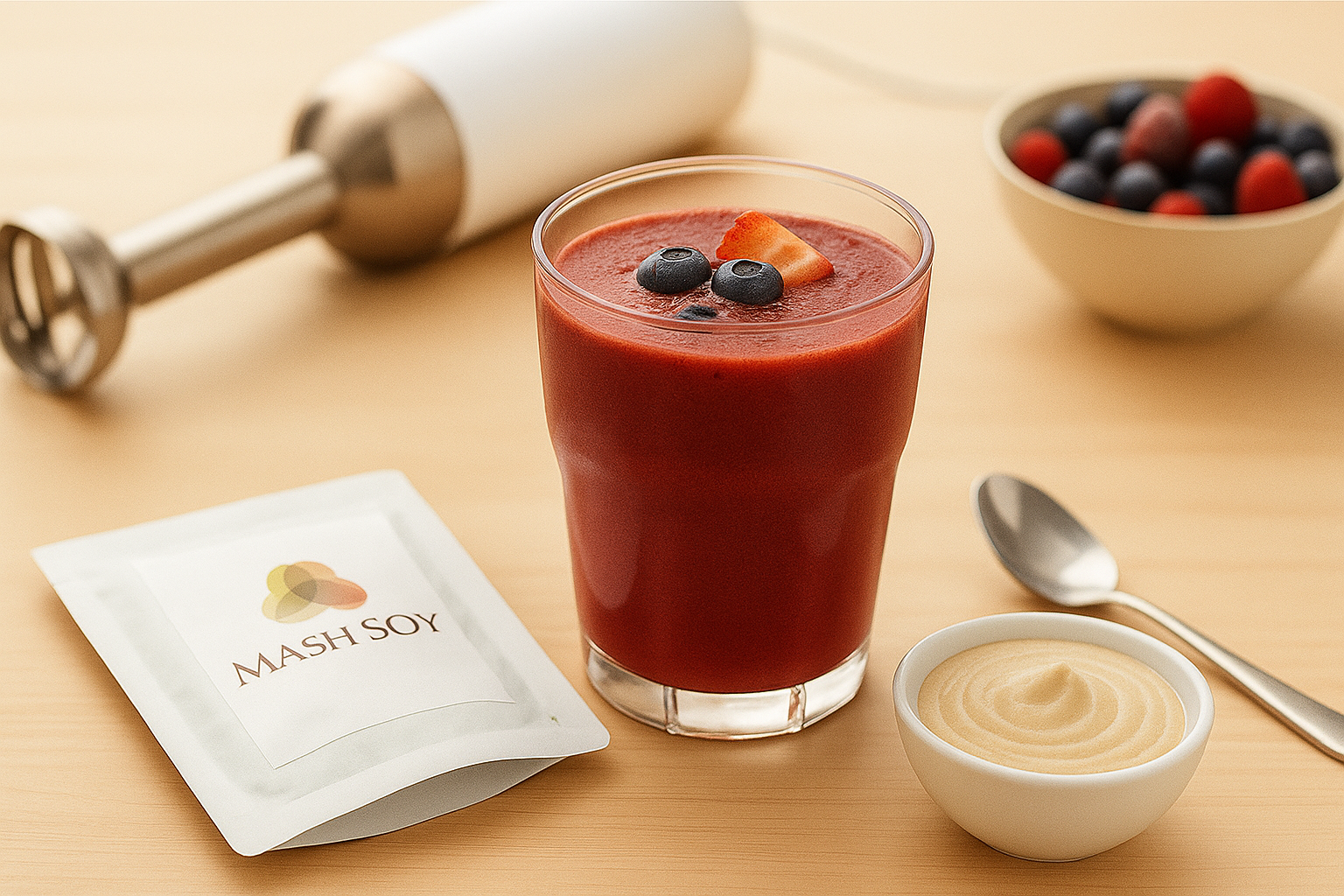 例えば、冷凍ベリーミックス・大豆ペースト「MASH SOY」・水(各80g)にはちみつ大さじ1をミキサーにかけるだけで、ベリースムージーの完成です。
