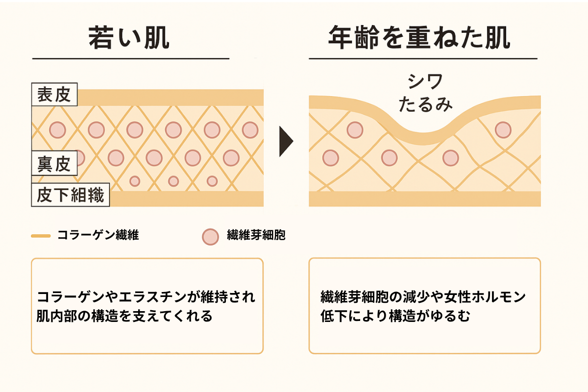 しかし、紫外線や酸化ストレス、ホルモン低下などによりその働きが弱まると、肌内部の構造がゆるみ、ハリや弾力が失われやすくなります。