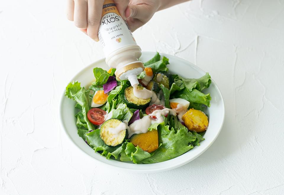 北海道産 大豆ペースト MASH SOYと調味料を合わせた、健康志向の新しいソースです。マヨネーズやドレッシングのカロリー・塩分が気になる方に、ぜひ試して欲しい軽やかな味わいです。